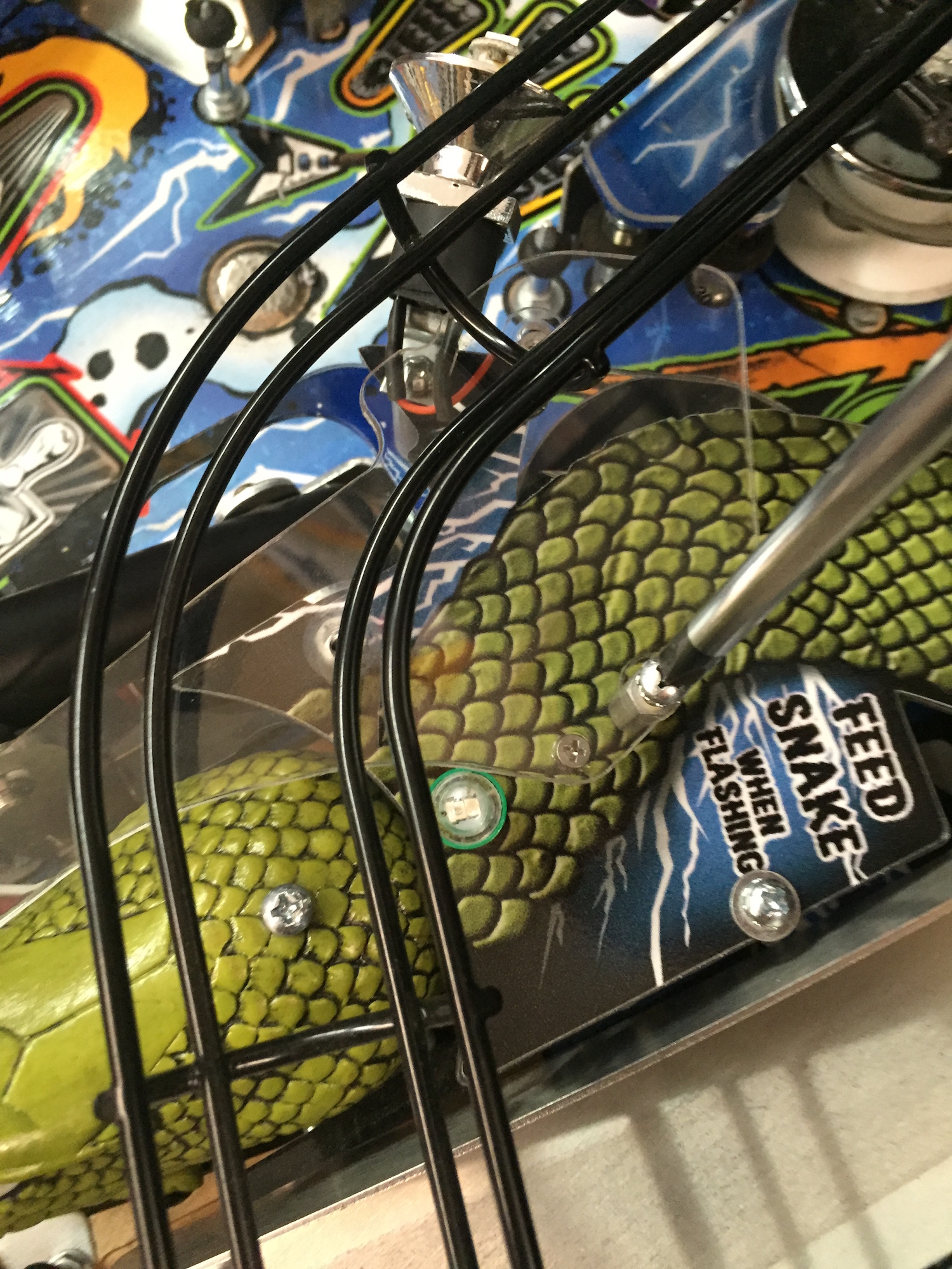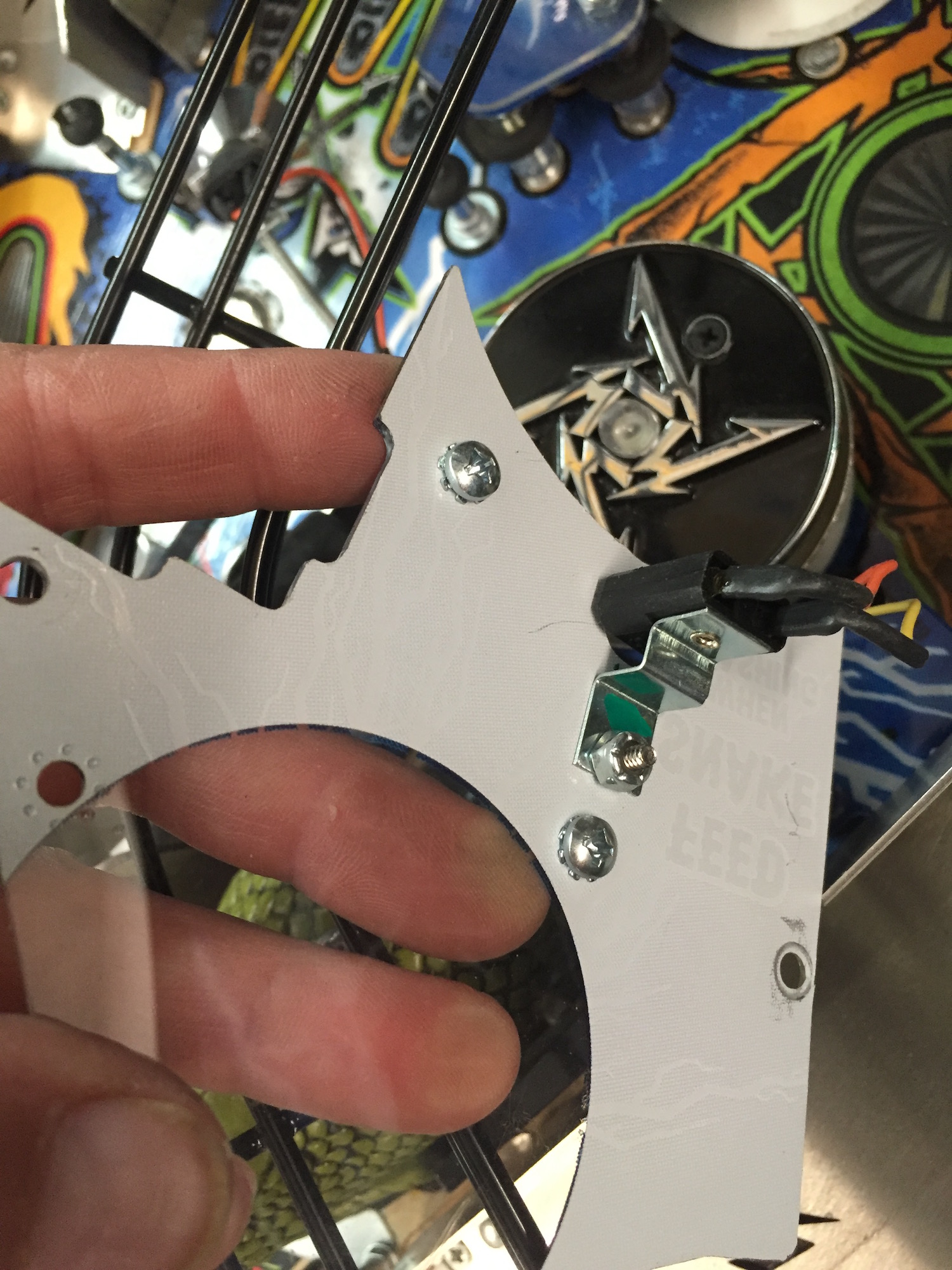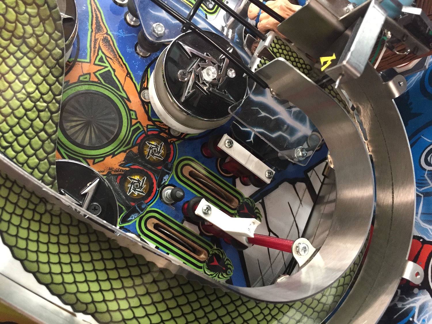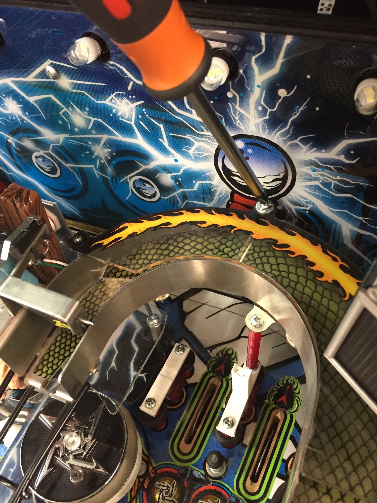 When removing screws from the playfield, reinstall by first turning them counter-clockwise to match the original groove in order to respect the integrity of the playfield wood.