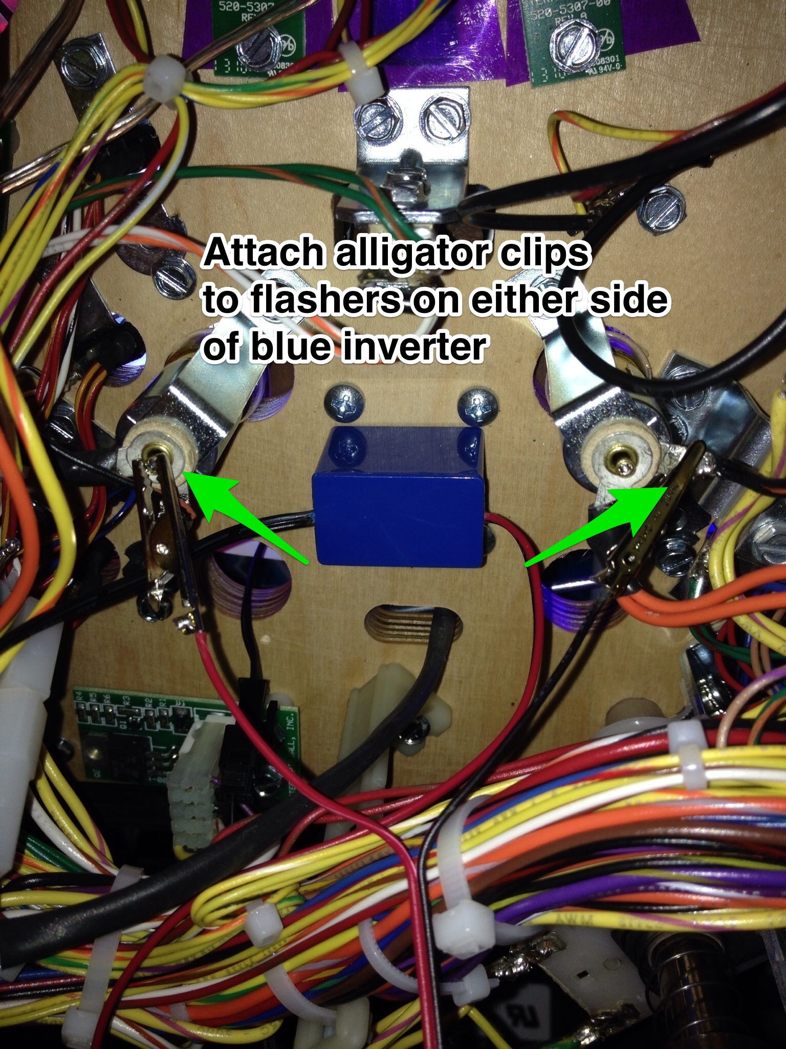 - When it is though the hole reconnect the connector wire to the blue inverter. NOTE: Please take care to ensure you reconnect correctly to avoid damage to inverter and EL wire. Attach the inverter to the bottom of the playfield using the double sided tape provided.